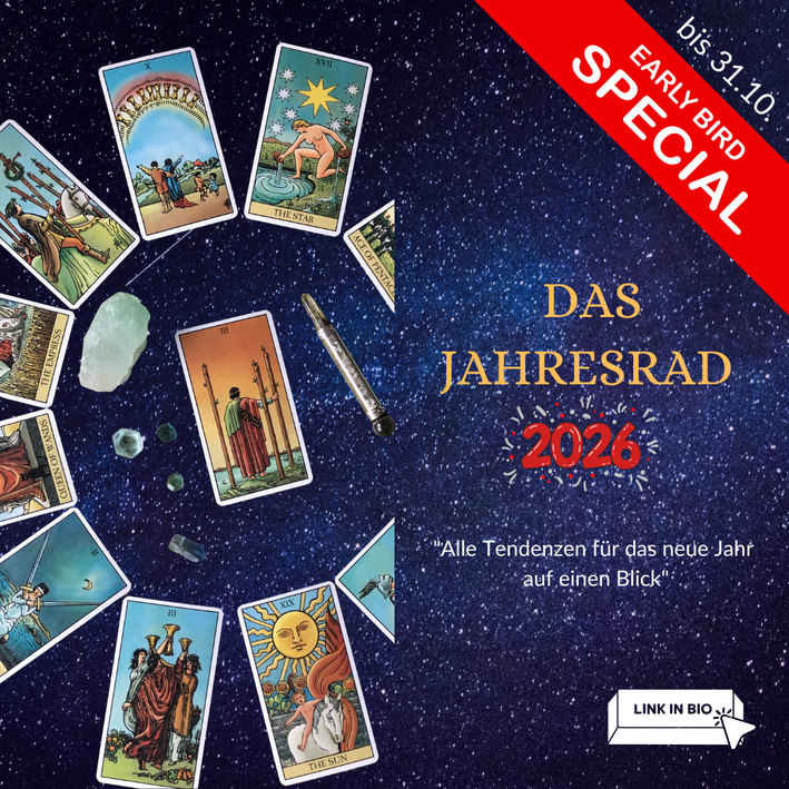 Wer gut vorbereitet in sein neues Jahr starten möchte, kann ab sofort sein persönliches "Jahresrad 2026" zum Sonderpreis von € 90,- buchen! Dieses Angebot gilt bis einschließlich 31. Oktober 2025.